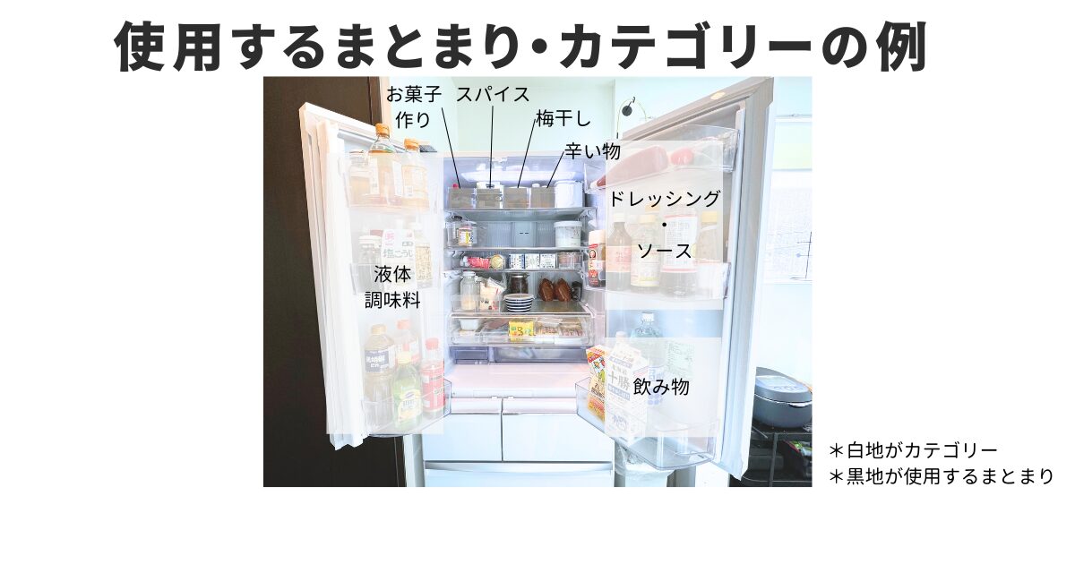 複数の人が冷蔵庫を頻繁に使う場合、一般的なカテゴリー(スーパーで販売されているカテゴリー)を使用することで、だれでもどこに何があるか判断しやすくなります。