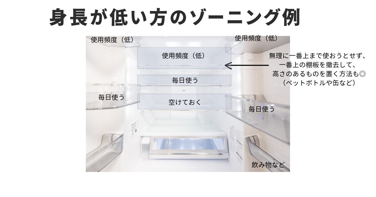主に使う人の身長、目線に合わせてゾーニングをします。身長が高い分には最上段の奥まで使えますが、そうでない場合は上の段に食品を置いてしまうと見えない、手が届かなくなってしまいますので注意してください。