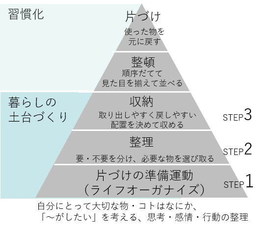 このように、片付けはピラミッド型で考えることができます。土台から上に、一つ一つのステップを順番に行っていく方がうまくいきます。