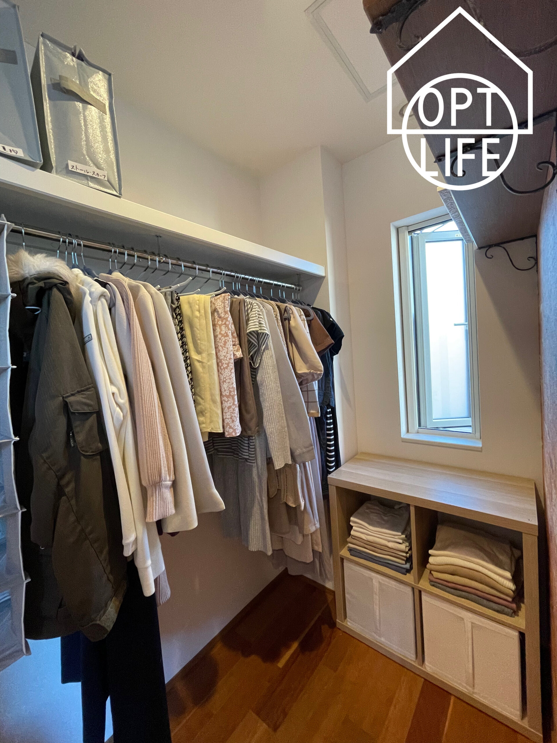 ハンガーパイプは、半分ずつに分けて今着る服とシーズンオフの服に分けています(ホコリ除けを撮影後に提案しています)。